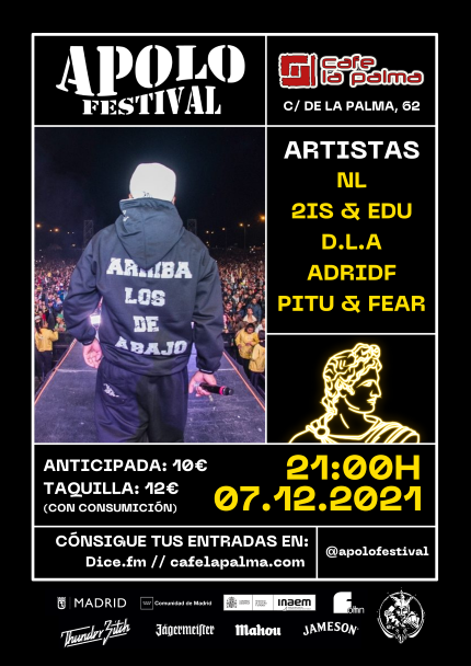 Para esta edición underground de Apolo Festival hemos preparado el mejor cartel de hip hop emergente en el radio de acción de Majadahonda: PITU & FEAR, ADRIDF, D. L. A., 2IS & EDU y NLEON.