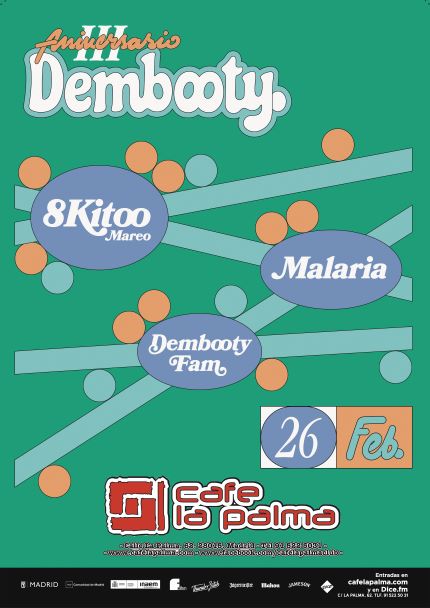 Desde Granada se viene el dj y productor 8kitoo, lo mejorcito del momento, representando a Mareo. También nos pondrá a bailar Malaria, clásico de la escena madrileña y visionario donde los haya. Junto con el equipo Dembooty al completo, Brava, Umami y Crks290, la noche promete ser sudorosa, memorable y cargada de bass.