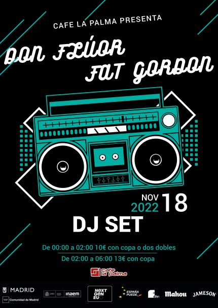 El combo de agitadores nocturnos formado por los Djs y productores DON FLUOR y FAT GORDON vuelven a asaltar la cabina de 21 years of history, and Café la Palma is one of the most dynamic music venues in Madrid, and a pioneer in the introduction of «first drink» concept. We are placed in Madrid’s downtown. Our philosophy is escape from any conventionalism, getting from Café la Palma a multi-dimensional place, a labyrinth full of amazing novelties. Café la Palma is for sure the best place for leisure and culture, to find all kind of surprises, in a constant process of change, adaptable to your mood. Only decide where to sit, and have some joy. You can sit and have a chat with your friends, with some cups of delicious coffee; enjoy evocative oriental beats an irresistible cocktails in the arab tent; or join into a concert with amazing Madrid’s underground bands, or well known pop musicians; or going mad with our dance floor, with best Madrid DJs. We provide a complete variety of services of entertaiment. And our staff is kind, efficient and professional. The dance floor, and concerts hall is for sure the core of Café la Palma. We proudly feel like a meeting point for curious, dynamic people. Like our customers, we are sophisticated and opened. All «tribes», all generations are welcome to feed and feel the magic of Café la Palma. About live music, our sound is one of the best in Madrid. In our scenario have played Dominique A, Jay Jay Johanson, Amaral, Addictive TV, Kenny Larkin, Ursula 1000, Programme, Mani (Primal Scream), The Gift, Amparanoia, Mala Rodríguez, Cycle, Josele Santiago, The Exception, The Coronas, Sex Museum, Vetusta Morla, Chojín Laziness Izal, Alamedadosoulna, La Bien Querida o Lichis and Goat Mechanics. para ofrecer a los paladares más exquisitos una sesión electrónica de altos vuelos.