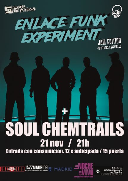 Enlace Funk Experiment Jam Edition es un laboratorio para experimentar con invitados especiales. Cada noche, la banda allstar Enlace Funk Experiment abrirá la sesión para invitar a un proyecto que presente su propuesta y terminar con una Jam irrepetible en la que los músicos interactúan experimentando por nuevos territorios musicales. Para esta primera edición auspiciada por JAZZ CON SABOR A CLUB presentan a SOUL CHEMTRAILS, un grupo de productores y compositores formado por Escandaloso Xpósito y Juan Arance donde fusionan R&B contemporáneo con Hip Hop, Neo Soul, Nu-Jazz y Música Electrónica.