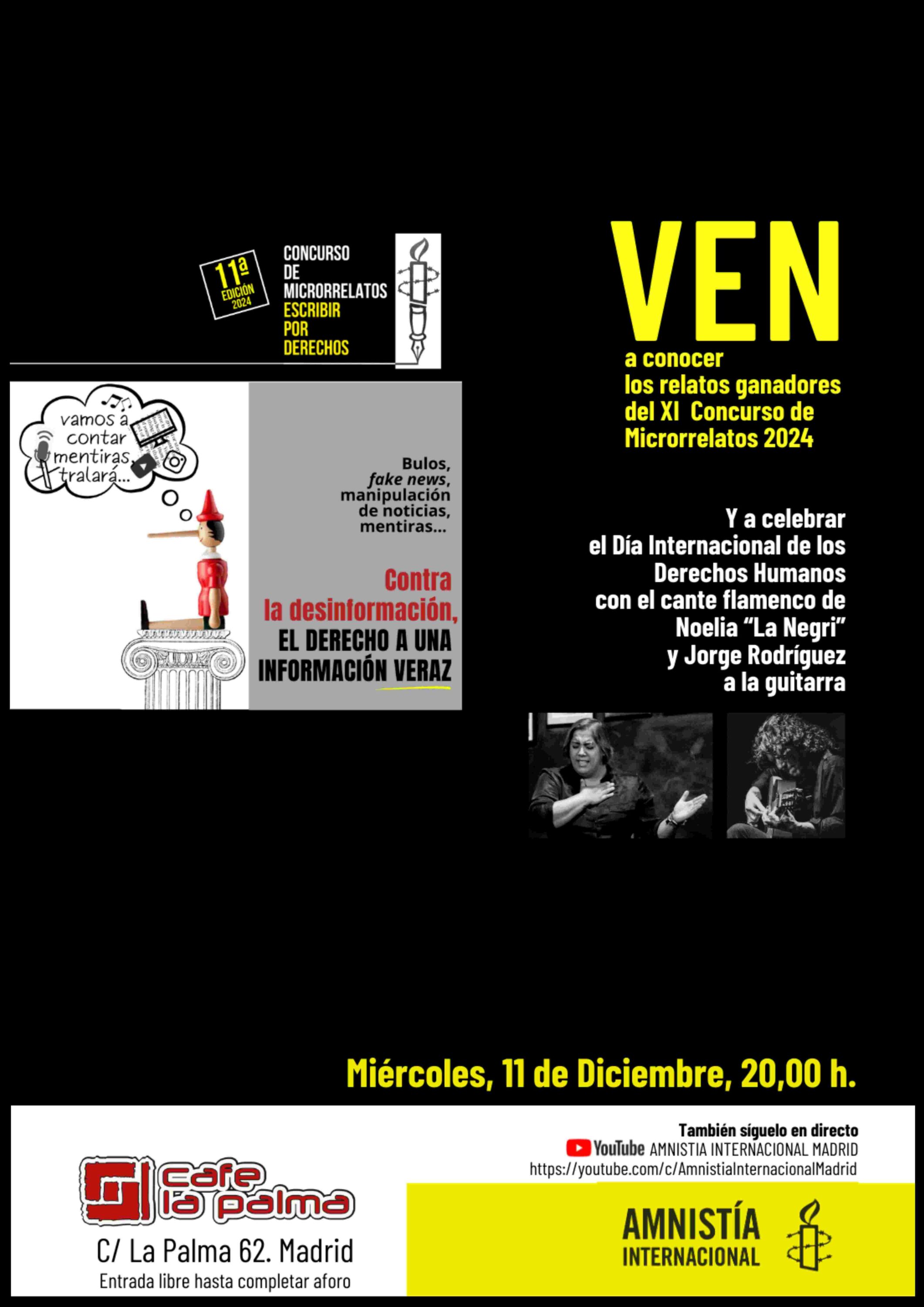 CAFE LA PALMA alberga la ceremonia de entrega de premios del Concurso de Microrrelatos de Amnistía Internacional Madrid en su XI edición, que este año versa sobre el derecho a una información veraz y contra la desinformación, los bulos y fake news.