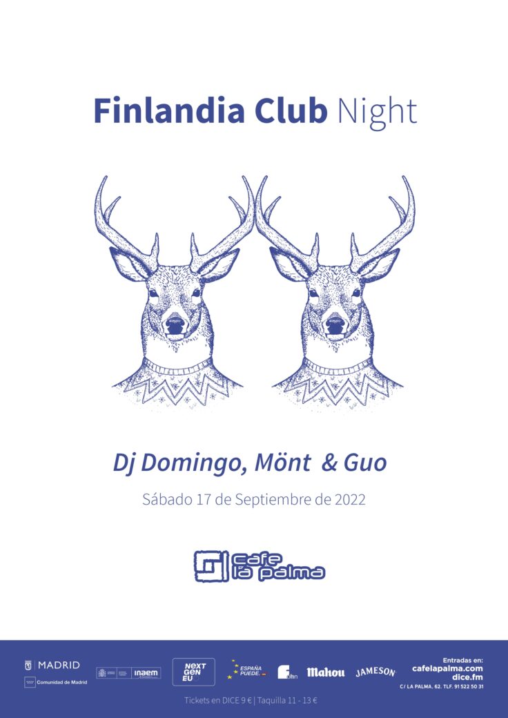 FINLANDIA CLUB, colectivo asiduo de la escena electrónica catalana y aragonesa desde 2004 desembarca por primera vez en Madrid, en el emblemático, elegante y sofisticado club 21 years of history, and Café la Palma is one of the most dynamic music venues in Madrid, and a pioneer in the introduction of «first drink» concept. We are placed in Madrid’s downtown. Our philosophy is escape from any conventionalism, getting from Café la Palma a multi-dimensional place, a labyrinth full of amazing novelties. Café la Palma is for sure the best place for leisure and culture, to find all kind of surprises, in a constant process of change, adaptable to your mood. Only decide where to sit, and have some joy. You can sit and have a chat with your friends, with some cups of delicious coffee; enjoy evocative oriental beats an irresistible cocktails in the arab tent; or join into a concert with amazing Madrid’s underground bands, or well known pop musicians; or going mad with our dance floor, with best Madrid DJs. We provide a complete variety of services of entertaiment. And our staff is kind, efficient and professional. The dance floor, and concerts hall is for sure the core of Café la Palma. We proudly feel like a meeting point for curious, dynamic people. Like our customers, we are sophisticated and opened. All «tribes», all generations are welcome to feed and feel the magic of Café la Palma. About live music, our sound is one of the best in Madrid. In our scenario have played Dominique A, Jay Jay Johanson, Amaral, Addictive TV, Kenny Larkin, Ursula 1000, Programme, Mani (Primal Scream), The Gift, Amparanoia, Mala Rodríguez, Cycle, Josele Santiago, The Exception, The Coronas, Sex Museum, Vetusta Morla, Chojín Laziness Izal, Alamedadosoulna, La Bien Querida o Lichis and Goat Mechanics.. Promotores activos y devotos orgullosos e incansables del imprescindible Andrew Weatherall y todo lo que su leyenda representa, FINLANDIA CLUB se ha convertido con el paso de los años en un referente del ambiente underground barcelonés y afterhours secretos pero también de los clubs de renombre de la ciudad condal.