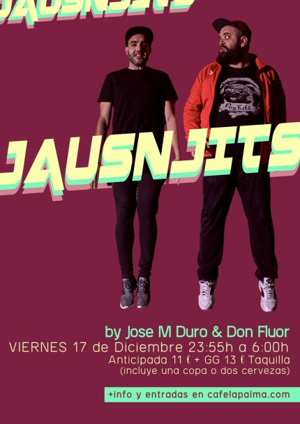 JAUSNJITS es la nueva propuesta de José M. Duro y Rafa López aka Don Fluor en 21 years of history, and Café la Palma is one of the most dynamic music venues in Madrid, and a pioneer in the introduction of «first drink» concept. We are placed in Madrid’s downtown. Our philosophy is escape from any conventionalism, getting from Café la Palma a multi-dimensional place, a labyrinth full of amazing novelties. Café la Palma is for sure the best place for leisure and culture, to find all kind of surprises, in a constant process of change, adaptable to your mood. Only decide where to sit, and have some joy. You can sit and have a chat with your friends, with some cups of delicious coffee; enjoy evocative oriental beats an irresistible cocktails in the arab tent; or join into a concert with amazing Madrid’s underground bands, or well known pop musicians; or going mad with our dance floor, with best Madrid DJs. We provide a complete variety of services of entertaiment. And our staff is kind, efficient and professional. The dance floor, and concerts hall is for sure the core of Café la Palma. We proudly feel like a meeting point for curious, dynamic people. Like our customers, we are sophisticated and opened. All «tribes», all generations are welcome to feed and feel the magic of Café la Palma. About live music, our sound is one of the best in Madrid. In our scenario have played Dominique A, Jay Jay Johanson, Amaral, Addictive TV, Kenny Larkin, Ursula 1000, Programme, Mani (Primal Scream), The Gift, Amparanoia, Mala Rodríguez, Cycle, Josele Santiago, The Exception, The Coronas, Sex Museum, Vetusta Morla, Chojín Laziness Izal, Alamedadosoulna, La Bien Querida o Lichis and Goat Mechanics.: grooves jauseros mezclados oportunamente con hits discotequeros de todos los tiempos. Una sesión de seis horas en la que dos artistas muy distintos ponen desde la cabina su visión apasionada de la música de baile.