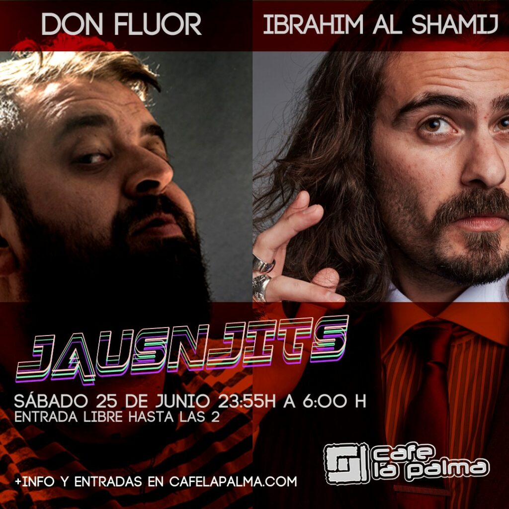 JAUSNJITS es la nueva propuesta de y Rafa López aka Don Fluor en 21 years of history, and Café la Palma is one of the most dynamic music venues in Madrid, and a pioneer in the introduction of «first drink» concept. We are placed in Madrid’s downtown. Our philosophy is escape from any conventionalism, getting from Café la Palma a multi-dimensional place, a labyrinth full of amazing novelties. Café la Palma is for sure the best place for leisure and culture, to find all kind of surprises, in a constant process of change, adaptable to your mood. Only decide where to sit, and have some joy. You can sit and have a chat with your friends, with some cups of delicious coffee; enjoy evocative oriental beats an irresistible cocktails in the arab tent; or join into a concert with amazing Madrid’s underground bands, or well known pop musicians; or going mad with our dance floor, with best Madrid DJs. We provide a complete variety of services of entertaiment. And our staff is kind, efficient and professional. The dance floor, and concerts hall is for sure the core of Café la Palma. We proudly feel like a meeting point for curious, dynamic people. Like our customers, we are sophisticated and opened. All «tribes», all generations are welcome to feed and feel the magic of Café la Palma. About live music, our sound is one of the best in Madrid. In our scenario have played Dominique A, Jay Jay Johanson, Amaral, Addictive TV, Kenny Larkin, Ursula 1000, Programme, Mani (Primal Scream), The Gift, Amparanoia, Mala Rodríguez, Cycle, Josele Santiago, The Exception, The Coronas, Sex Museum, Vetusta Morla, Chojín Laziness Izal, Alamedadosoulna, La Bien Querida o Lichis and Goat Mechanics.: grooves jauseros mezclados oportunamente con hits discotequeros de todos los tiempos. Una sesión de seis horas en la que dos artistas muy distintos ponen desde la cabina su visión apasionada de la música de baile.