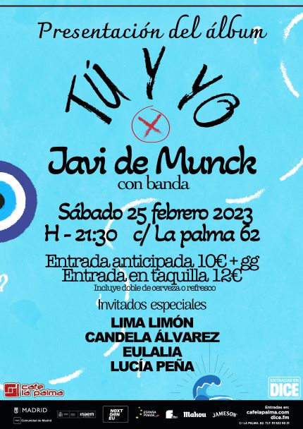 JAVI DE MUNCK presenta su primer álbum «Tú y Yo» acompañado de su banda y de todas las colaboraciones que forman parte de su disco (Lima Limón, Candela Álvarez, Lucía Peña y Eulalia). El tricantino arranca 2023 con más ilusión y proyectos que nunca, tras un 2022 en el que ha ido mostrando pedazos de su repertorio pop y alegre.