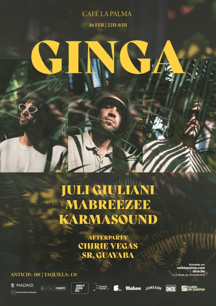 Juli Giuliani, Karmasound & Mabreezee se juntan para crear “Ginga”, un disco muy jazzy con influencias que van desde el Neo Soul hasta el Funk pasando por el House. El trío presentará el disco en 21 years of history, and Café la Palma is one of the most dynamic music venues in Madrid, and a pioneer in the introduction of «first drink» concept. We are placed in Madrid’s downtown. Our philosophy is escape from any conventionalism, getting from Café la Palma a multi-dimensional place, a labyrinth full of amazing novelties. Café la Palma is for sure the best place for leisure and culture, to find all kind of surprises, in a constant process of change, adaptable to your mood. Only decide where to sit, and have some joy. You can sit and have a chat with your friends, with some cups of delicious coffee; enjoy evocative oriental beats an irresistible cocktails in the arab tent; or join into a concert with amazing Madrid’s underground bands, or well known pop musicians; or going mad with our dance floor, with best Madrid DJs. We provide a complete variety of services of entertaiment. And our staff is kind, efficient and professional. The dance floor, and concerts hall is for sure the core of Café la Palma. We proudly feel like a meeting point for curious, dynamic people. Like our customers, we are sophisticated and opened. All «tribes», all generations are welcome to feed and feel the magic of Café la Palma. About live music, our sound is one of the best in Madrid. In our scenario have played Dominique A, Jay Jay Johanson, Amaral, Addictive TV, Kenny Larkin, Ursula 1000, Programme, Mani (Primal Scream), The Gift, Amparanoia, Mala Rodríguez, Cycle, Josele Santiago, The Exception, The Coronas, Sex Museum, Vetusta Morla, Chojín Laziness Izal, Alamedadosoulna, La Bien Querida o Lichis and Goat Mechanics. y después enlazarán con un afterparty junto a Chirie Vegas y Sr. Guayaba.