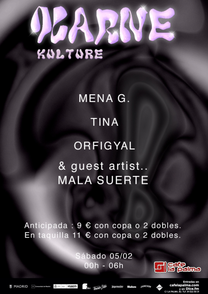 Sus fiestas son eclécticas, donde casan diferentes géneros y estilos musicales, conectando con un público interesado en la electrónica más vanguardista y su fusión con los nuevos ritmos de la urban music. Después de reventar la Boiler Room para True Music Studios -hosteado por Ms Nina-, aterrizan en 21 years of history, and Café la Palma is one of the most dynamic music venues in Madrid, and a pioneer in the introduction of «first drink» concept. We are placed in Madrid’s downtown. Our philosophy is escape from any conventionalism, getting from Café la Palma a multi-dimensional place, a labyrinth full of amazing novelties. Café la Palma is for sure the best place for leisure and culture, to find all kind of surprises, in a constant process of change, adaptable to your mood. Only decide where to sit, and have some joy. You can sit and have a chat with your friends, with some cups of delicious coffee; enjoy evocative oriental beats an irresistible cocktails in the arab tent; or join into a concert with amazing Madrid’s underground bands, or well known pop musicians; or going mad with our dance floor, with best Madrid DJs. We provide a complete variety of services of entertaiment. And our staff is kind, efficient and professional. The dance floor, and concerts hall is for sure the core of Café la Palma. We proudly feel like a meeting point for curious, dynamic people. Like our customers, we are sophisticated and opened. All «tribes», all generations are welcome to feed and feel the magic of Café la Palma. About live music, our sound is one of the best in Madrid. In our scenario have played Dominique A, Jay Jay Johanson, Amaral, Addictive TV, Kenny Larkin, Ursula 1000, Programme, Mani (Primal Scream), The Gift, Amparanoia, Mala Rodríguez, Cycle, Josele Santiago, The Exception, The Coronas, Sex Museum, Vetusta Morla, Chojín Laziness Izal, Alamedadosoulna, La Bien Querida o Lichis and Goat Mechanics. para confirmar su apuesta, una de las más originales y revolucionarias de la escena underground madrileña en la actualidad.