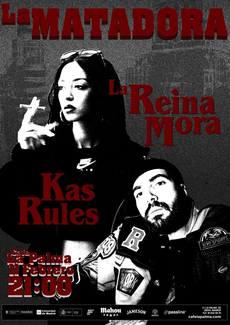 La Reina Mora, artista de origen marroquí, nacida en Córdoba y criada en Málaga, y Kas Rules, productor nacido y criado en la ciudad de Málaga, unen fuerzas en un proyecto que nace desde la raíz del underground. Con estilos personales, versátiles y muy marcados que combinan el rap más crudo con el melódico, tanto en la voz como en la instrumental, llevan casi tres años dando forma a un álbum intenso, honesto y sin filtros. Tras conocerse hace cuatro años, decidieron crear un trabajo que habla de lo real, de lo que duele y de lo que pesa. Hoy presentan LA MATADORA, un álbum que no viene a gustar: viene a dejar huella.