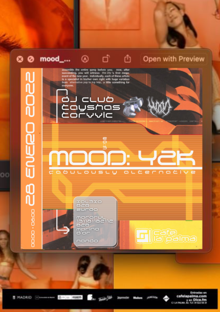 Para esta edición de MOOD nos enfocamos en los años 2000 y siempre mezclando música del presente y futuro. A los platos Torvvic, Tayshas y miembros de Dj Club (XOL3XO, Zurda, Mararul, Marina d’or y NANDO).
