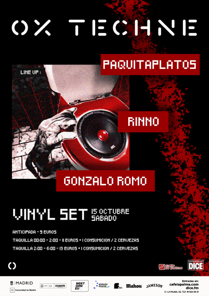 OX TECHNE es un colectivo que fue creado en 2021 por Paquitaplatos (aka Esterne Moog) con la intención de fundir arte y música en vinilo, aunque en sí la música ya es un arte. El colectivo se traslada y afinca en Madrid con el propósito de hacer bailar a la capital con ritmos como el House, Microhouse, Dub Techno, Minimal e, incluso, hay noches que puedes encontrar a éste deleitando al público con sonidos estridentes del Techno.