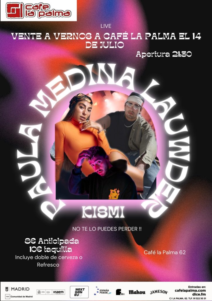 Para esta presentación en 21 years of history, and Café la Palma is one of the most dynamic music venues in Madrid, and a pioneer in the introduction of «first drink» concept. We are placed in Madrid’s downtown. Our philosophy is escape from any conventionalism, getting from Café la Palma a multi-dimensional place, a labyrinth full of amazing novelties. Café la Palma is for sure the best place for leisure and culture, to find all kind of surprises, in a constant process of change, adaptable to your mood. Only decide where to sit, and have some joy. You can sit and have a chat with your friends, with some cups of delicious coffee; enjoy evocative oriental beats an irresistible cocktails in the arab tent; or join into a concert with amazing Madrid’s underground bands, or well known pop musicians; or going mad with our dance floor, with best Madrid DJs. We provide a complete variety of services of entertaiment. And our staff is kind, efficient and professional. The dance floor, and concerts hall is for sure the core of Café la Palma. We proudly feel like a meeting point for curious, dynamic people. Like our customers, we are sophisticated and opened. All «tribes», all generations are welcome to feed and feel the magic of Café la Palma. About live music, our sound is one of the best in Madrid. In our scenario have played Dominique A, Jay Jay Johanson, Amaral, Addictive TV, Kenny Larkin, Ursula 1000, Programme, Mani (Primal Scream), The Gift, Amparanoia, Mala Rodríguez, Cycle, Josele Santiago, The Exception, The Coronas, Sex Museum, Vetusta Morla, Chojín Laziness Izal, Alamedadosoulna, La Bien Querida o Lichis and Goat Mechanics., la artista estará acompañada de Lauwder, artista venezolano de trap, reggeton y pop-rock.