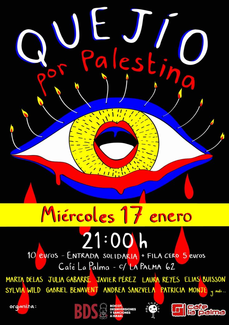 QUEJÍO POR PALESTINA es un evento que reúne a varias artistas vinculadas al flamenco para reivindicar desde su música y poesía por la guerra en Palestina. A través de composiciones propias y obras del repertorio flamenco tradicional, las artistas pondrán de manifiesto el dolor y rabia que sentimos muchas desde la lejanía, y la impotencia al ver como nuestras instituciones permiten que se lleve a cabo un genocidio más en la historia.