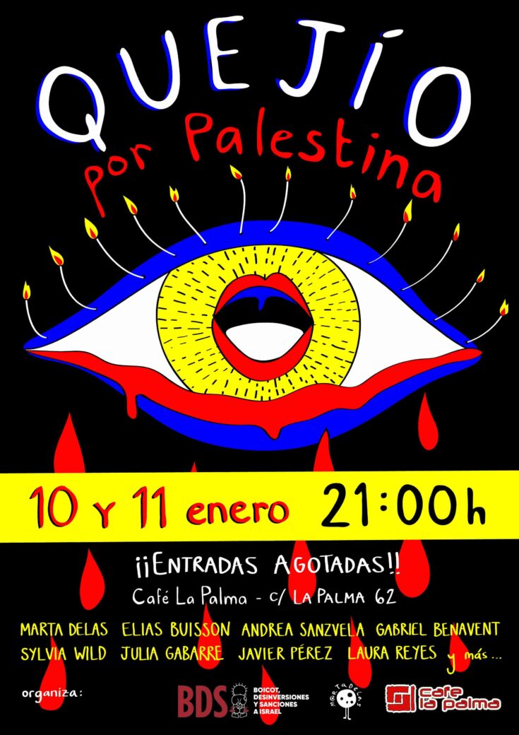 QUEJÍO POR PALESTINA es un evento que reúne a varias artistas vinculadas al flamenco para reivindicar desde su música y poesía por la guerra en Palestina. A través de composiciones propias y obras del repertorio flamenco tradicional, las artistas pondrán de manifiesto el dolor y rabia que sentimos muchas desde la lejanía, y la impotencia al ver como nuestras instituciones permiten que se lleve a cabo un genocidio más en la historia.