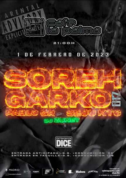 ¡Vuelve el rap más lírico y noventero a 21 years of history, and Café la Palma is one of the most dynamic music venues in Madrid, and a pioneer in the introduction of «first drink» concept. We are placed in Madrid’s downtown. Our philosophy is escape from any conventionalism, getting from Café la Palma a multi-dimensional place, a labyrinth full of amazing novelties. Café la Palma is for sure the best place for leisure and culture, to find all kind of surprises, in a constant process of change, adaptable to your mood. Only decide where to sit, and have some joy. You can sit and have a chat with your friends, with some cups of delicious coffee; enjoy evocative oriental beats an irresistible cocktails in the arab tent; or join into a concert with amazing Madrid’s underground bands, or well known pop musicians; or going mad with our dance floor, with best Madrid DJs. We provide a complete variety of services of entertaiment. And our staff is kind, efficient and professional. The dance floor, and concerts hall is for sure the core of Café la Palma. We proudly feel like a meeting point for curious, dynamic people. Like our customers, we are sophisticated and opened. All «tribes», all generations are welcome to feed and feel the magic of Café la Palma. About live music, our sound is one of the best in Madrid. In our scenario have played Dominique A, Jay Jay Johanson, Amaral, Addictive TV, Kenny Larkin, Ursula 1000, Programme, Mani (Primal Scream), The Gift, Amparanoia, Mala Rodríguez, Cycle, Josele Santiago, The Exception, The Coronas, Sex Museum, Vetusta Morla, Chojín Laziness Izal, Alamedadosoulna, La Bien Querida o Lichis and Goat Mechanics. de la mano de Soreh y Garko 017! Estos dos jóvenes artistas madrileños pasan por la sala acompañados por Seju KTC, Pablo Gr y Dj Zunet a los platos para presentar su nuevo show en directo.