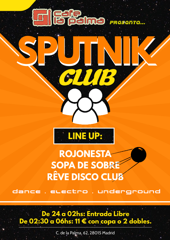 Para esta edición en 21 years of history, and Café la Palma is one of the most dynamic music venues in Madrid, and a pioneer in the introduction of «first drink» concept. We are placed in Madrid’s downtown. Our philosophy is escape from any conventionalism, getting from Café la Palma a multi-dimensional place, a labyrinth full of amazing novelties. Café la Palma is for sure the best place for leisure and culture, to find all kind of surprises, in a constant process of change, adaptable to your mood. Only decide where to sit, and have some joy. You can sit and have a chat with your friends, with some cups of delicious coffee; enjoy evocative oriental beats an irresistible cocktails in the arab tent; or join into a concert with amazing Madrid’s underground bands, or well known pop musicians; or going mad with our dance floor, with best Madrid DJs. We provide a complete variety of services of entertaiment. And our staff is kind, efficient and professional. The dance floor, and concerts hall is for sure the core of Café la Palma. We proudly feel like a meeting point for curious, dynamic people. Like our customers, we are sophisticated and opened. All «tribes», all generations are welcome to feed and feel the magic of Café la Palma. About live music, our sound is one of the best in Madrid. In our scenario have played Dominique A, Jay Jay Johanson, Amaral, Addictive TV, Kenny Larkin, Ursula 1000, Programme, Mani (Primal Scream), The Gift, Amparanoia, Mala Rodríguez, Cycle, Josele Santiago, The Exception, The Coronas, Sex Museum, Vetusta Morla, Chojín Laziness Izal, Alamedadosoulna, La Bien Querida o Lichis and Goat Mechanics. contaremos con Sopa de Sobre, Rêve Disco Club y Rojonesta, patrón de Sputnik Club.