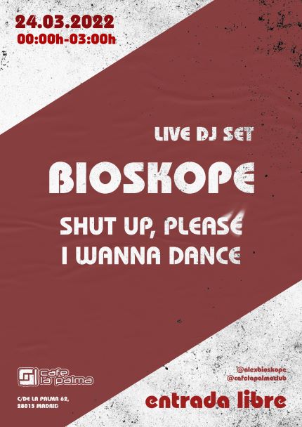 Bioskope vuelve a CAFE LA PALMA celebrando el lanzamiento de su nuevo EP de electrónica disco “Shut Up, Please, I Wanna Dance (Part Two)» para llenar de nuevo la pista con la mejor música nu-disco, french house y electrónica bailable de artistas como Todd Terje, Breakbot o Daft Punk. Los Dj sets de Bioskope consisten en una mezcla orgánica que propone cambios y FX nuevos en cada sesión.
