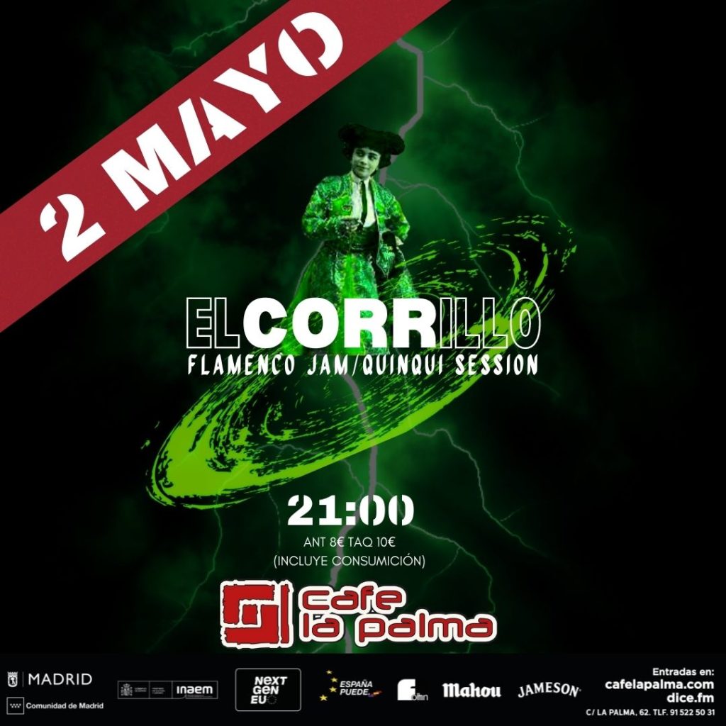 El núcleo duro de la jam El Corrillo es un cuarteto formado por Roberto Monteiro a la guitarra flamenca, Alejandro Páez al bajo, David Mexicat a la percusión y la voz de Saray Frutos. El Corrillo interpreta un recorrido de temas que navegan desde la rumba al bolero, pasando por la copla, el jazz y el flamenco rock de los ’70 y 80’, todo con un sello muy particular. Además, entre los músicos habituales encontramos también a Álvaro Vallejo a la batería, Nico Martín a la guitarra eléctrica y Alexander Vasquez al teclado. Y por si fuera poco, añaden a cada sesión un artista invitado al cante, mas la traca final con Dj Set de Anita Sinausia con mezclas de electrónica y cante jondo.