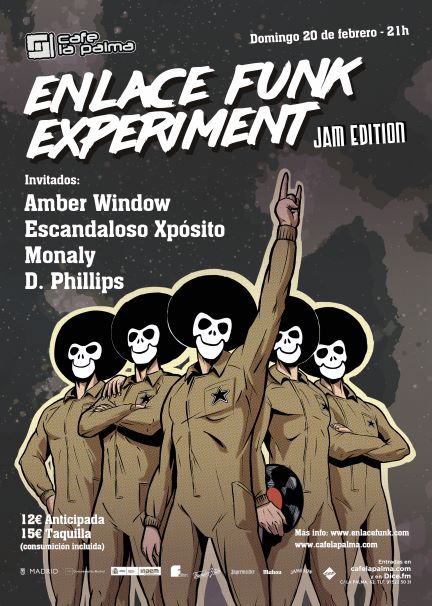 Enlace Funk Experiment Jam Edition es un laboratorio para experimentar con invitados especiales. Cada noche, la banda Enlace Funk Experiment abre la velada para invitar a un proyecto que presente su propuesta y terminar con una jam session irrepetible en la que los músicos interactúan experimentando por nuevos territorios musicales.