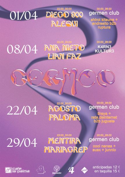 El objetivo de GERMEN es crear una experiencia en la que convivan los formatos de concierto y de club respetando la coherencia entre artistas. De esta forma, el público que acuda a los conciertos podrá disfrutar del resto del evento y descubrir nueva música. La localización de GERMEN en CAFE LA PALMA servirá como catalizador de este encuentro entre la vanguardia musical del momento.