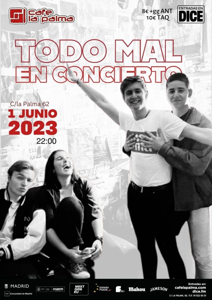 Todo Mal es un grupo de punk rock madrileño, que se caracteriza por sus canciones energéticas, pegadizas y con toques personales. Cantando a quién le venga en gana se han juntado para traer de vuelta el guitarreo madrileño, la distorsión y los golpes contundentes de batería. Ellos son: Jimena Olabarria (teclado), Jorge Navarro (guitarra), Javier Sanchez (batería) y Álvaro Zulueta (bajo). Todo Mal todavía no es tu grupo favorito, pero si no hacen las cosas del todo mal, acabarán por serlo.