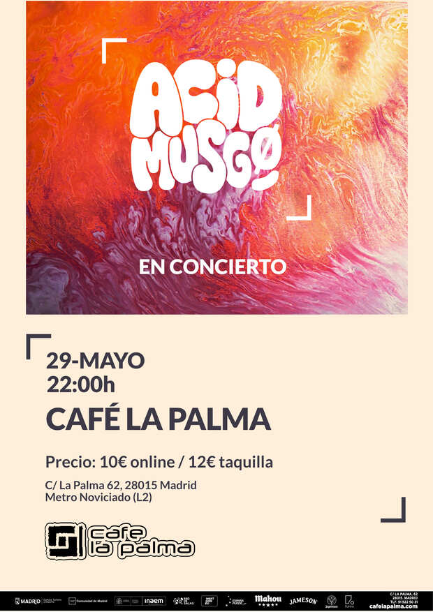 El escenario del Café La Palma se prepara para recibir a Acid Musgo, un sexteto madrileño que ha convertido el groove en su brújula y la libertad creativa en su bandera. Lejos de atarse a las reglas de un género estricto, esta tripulación de exploradores sonoros propone una inmersión profunda por las aguas del neo soul, el acid jazz y las texturas electrónicas, todo ello atravesado por la riqueza rítmica del afro-jazz contemporáneo. Su propuesta es cruda, urbana y profundamente magnética; el equivalente sonoro a una película novel de cine kinki rodada en las calles del Madrid actual.
