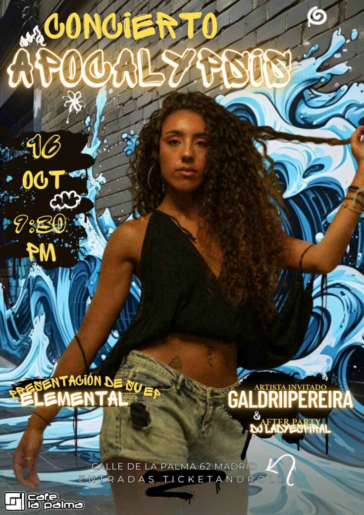 APOCALYPSIS es una cantante y compositora madrileña de 28 años. En esta ocasión, nos presenta su primer EP, «Elemental» que fusiona el R&B contemporáneo y el hip hop de los 2000 buscando revivir esa época dorada, pero con un componente innovador: todas las canciones son en español.