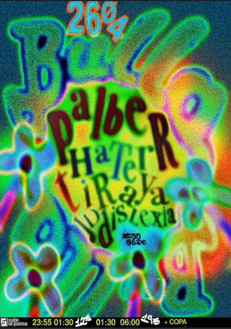 Después de varios meses de espera, la séptima edición de la fiesta vuelve de la forma más especial posible. Una de las características de Bulla es la apuesta por propuestas diferentes de djs emergentes, dentro de un marco propio, con el objetivo de aportar un aroma distinto a cada noche. En esta ocasión, el line up estará formado por Palber, Hater, Tiraya y JD Dislexia.