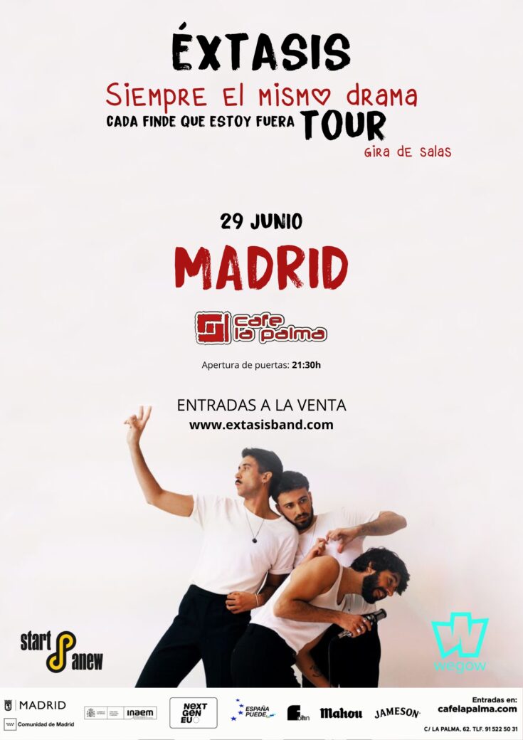 Éxtasis llega a Madrid en su nueva gira Siempre el mismo drama, cada finde que estoy fuera TOUR. A pesar de su corta trayectoria, el grupo de Barcelona ya es una de las bandas con más proyección del panorama pop rock del país y sus directos una oportunidad única de verlos en acción.
