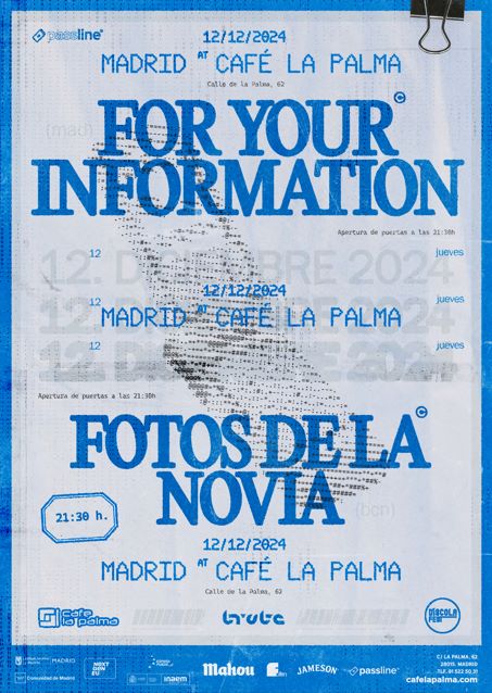 FOR YOUR INFORMATION hacen música que nace del hastío de la vida en la gran ciudad. La rutina, el cansancio y las ganas de dejarlo todo cristalizan en canciones para mostrar que el post-punk y su tentáculo más pop pueden moverte de la silla de tu oficina.
