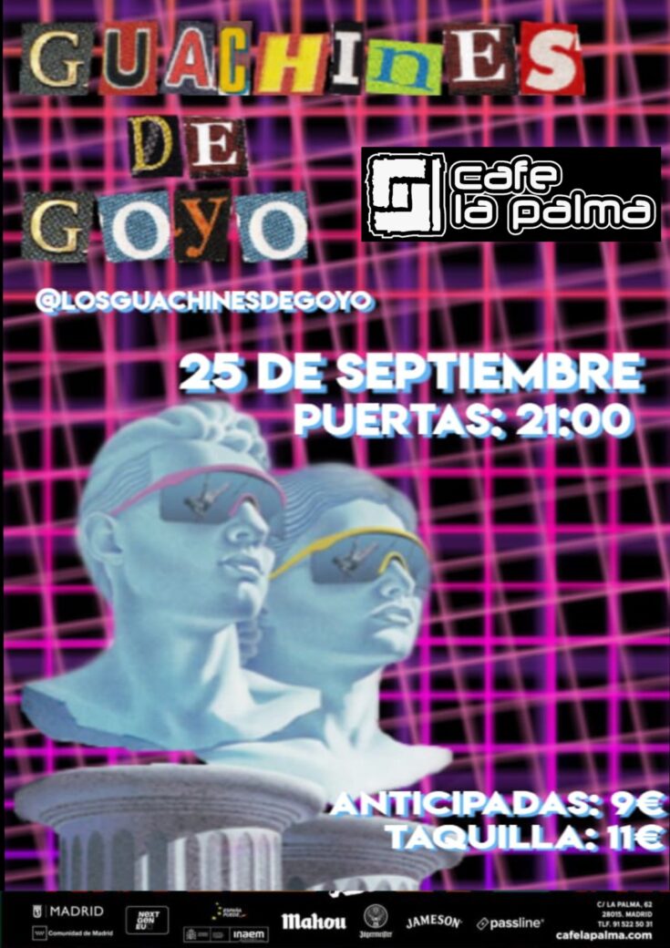 Con todos ustedes, salidos y criados de las barras del parque de El Retiro de Madrid, los GUACHINES DE GOYO. Un grupo con una energía contagiosa allá por donde van, pura alegría y danza primitiva, eso es lo que provocan en su público. Locura a ritmo de cumbia y un toque de cante flamenco, acariciado por la eléctrica melodía de su clarinete.