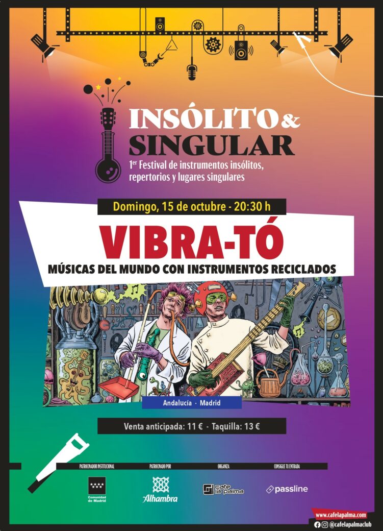 VIBRA-TÓ es un colectivo de músicos investigadores y multi-instrumentistas que crean instrumentos musicales a partir de objetos cotidianos y materiales de desecho, investigan acerca de instrumentos de todo el mundo y transmiten su amor por la música, el folclore y sus instrumentos a través de talleres, conciertos y divulgación en radio y televisión. Sus fundadores, Miguel Guinea y Joaquín Sánchez, se conocieron en 2004 cursando en la Universidad de Granada y desde entonces han viajado con su proyecto a cinco países diferentes, desde Brasil a Angola pasando por Nueva York ó Marruecos, metiéndose en retos y aventuras como el encargo de realizar 500 ukeleches (ukeleles con cartón de leche) para el Museo del Prado de Madrid o poner a 1.000 escolares a tocar un órgano humano gigante hecho de rollos papel higiénico en el Teatro Maestranza de Sevilla.