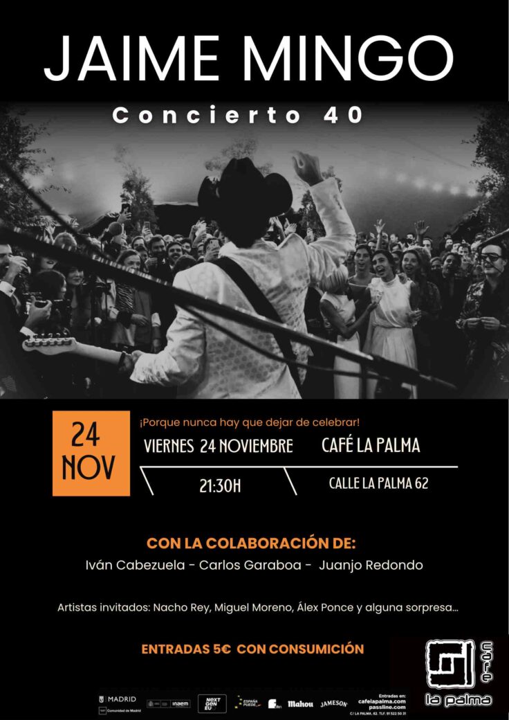 JAIME MINGO vuelve a CAFE LA PALMA después de casi un lustro con motivo de su 40 cumpleaños. Para esta ocasión especial, hará una recopilación de todos los temas que le han acompañado a lo lardo de su carrera musical, acompañado de una banda que elevará sus temas propios y versiones pop rock a otra dimensión.