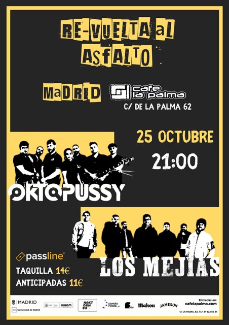 OKTOPUSSY es «ska fusión pa tu body»: así se definen esta experimentada banda que promete poner las tablas de Madrid ardiendo. Renovados, con las pilas cargadas y deseosos de volver a ver a sus seguidores cantar los temas de su nuevo trabajo que presentan durante este 2024. Hasta siete músicos defienden su potente directo y contagiarán las ganas de bailar y saltar.