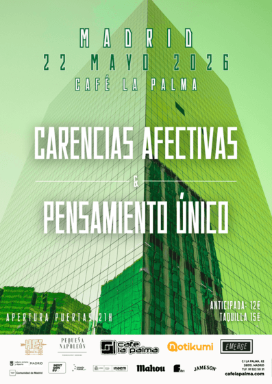 El próximo 22 de mayo, Café La Palma acogerá a los zaragozanos Pensamiento Único y a los madrileños Carencias Afectivas. La noche presentará un doble cartel que fusiona la vanguardia oscura con la urgencia guitarrera.