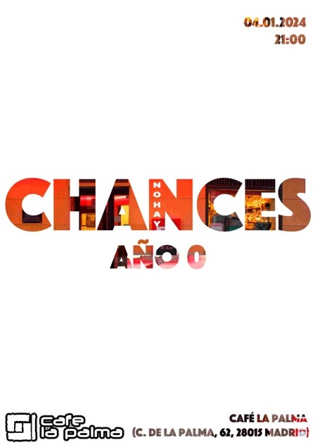 Lanzándose ahora también a los eventos en directo, NO HAY CHANCES celebra el primero en CAFE LA PALMA, organizando una velada con diversas actuaciones y presentando, aprovechando la ocasión, el inminente primer ejemplar de su revista en físico, que muy pronto estará a vuestro alcance.