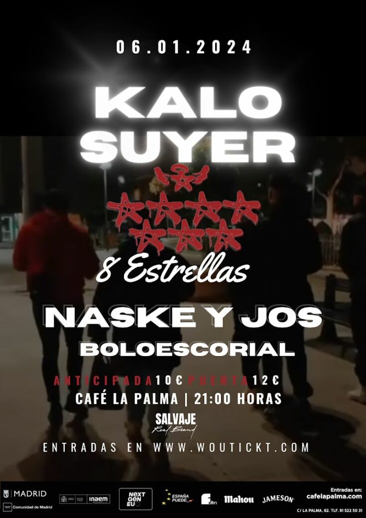 SUYER y KALO son dos raperos de Madrid. En este concierto, ambos artistas presentarán su trabajo conjunto “8 estrellas”, y además cantarán repertorio por separado.