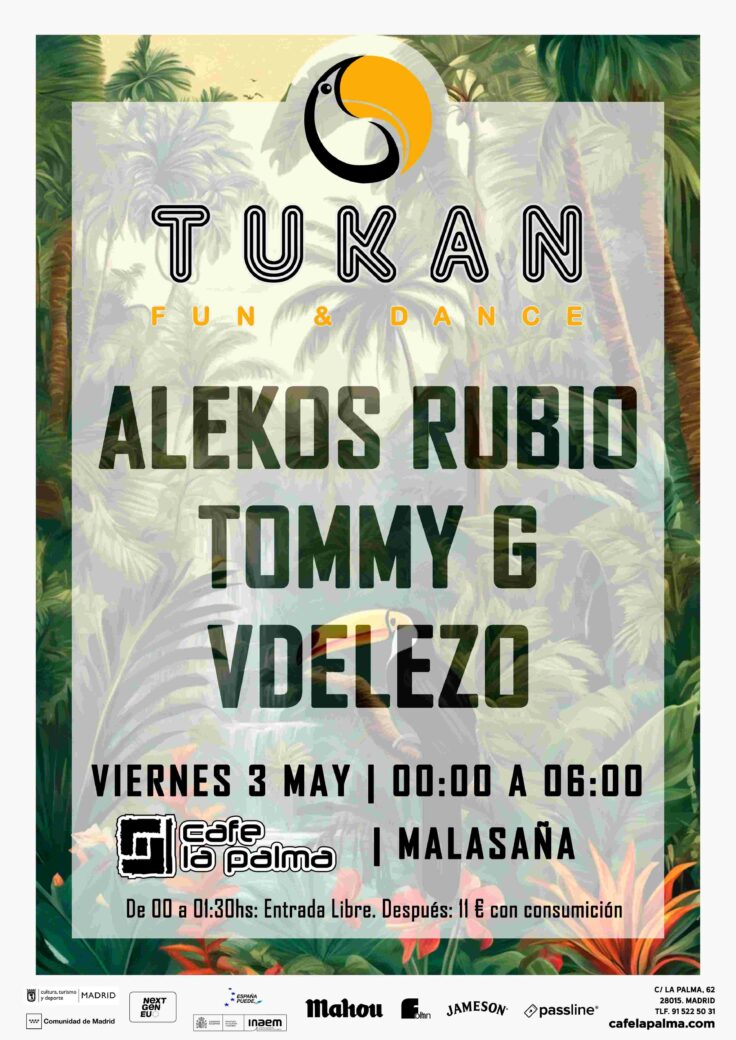 TUKAN son risas, familiaridad, frescura, alegría, novedades y recuerdos, son colores y sabores, dulce con un punto de picante. En esta sesión, además de los dos hosters de la fiesta, nuestros residentes ALEKOS RUBIO y TOMMY G, ya veteranos de la escena y habituales en los mejores clubes y festivales del país, contaremos con la presencia de VDELEZO como artista invitado.