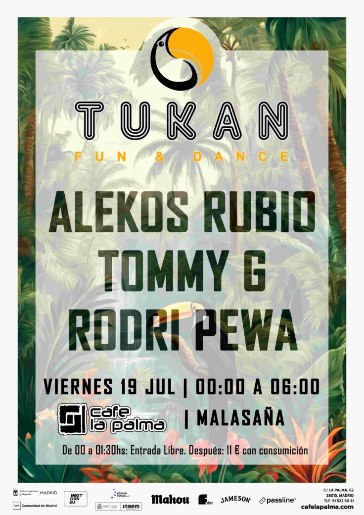 TUKAN son risas, familiaridad, frescura, alegría, novedades y recuerdos, son colores y sabores, dulce con un punto de picante. En esta sesión, además de los dos hosters de la fiesta, nuestros residentes ALEKOS RUBIO y TOMMY G, ya veteranos de la escena y habituales en los mejores clubes y festivales del país, contaremos con la presencia de RODRI PEWA como artista invitado.