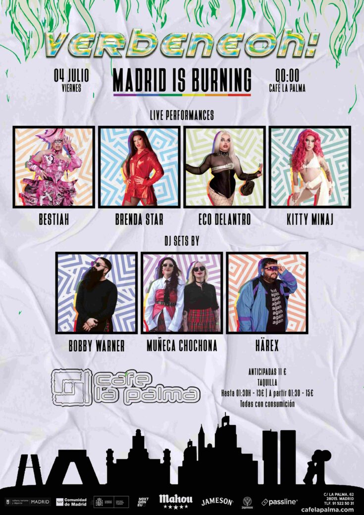Pero la fiesta no se queda ahí: a nivel nacional, VERBENEOH! trae a auténticas estrellas del drag como BRENDA STAR, ECO DELANTRO, BESTIAH (concursante de Drag Race España 3) y KITTY MINAJ, drag vogue de referencia en la Comunidad de Murcia. El show de todas las artistas estará integrado dentro de las sesiones creando así una fiesta en constante movimiento, con performances durante toda la noche.